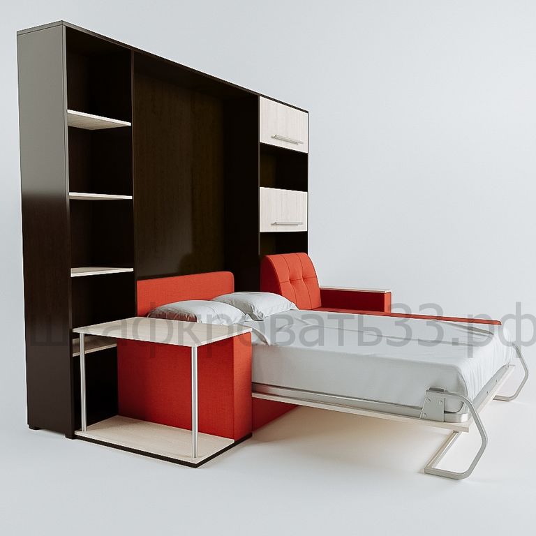 Наша фирма производит готовые решения для расширения пространства в вашем доме. Так откидная вертикальная кровать волшебным образом сделает вашу комнату больше на целых четыре квадратных метра и при этом даст возможность пользоваться в дневное время удобным угловым диваном с мягкими подлокотниками. Эта элитная модель так же оснащена двумя изящными стеллажами, на которых можно разместить книги или личные вещи.