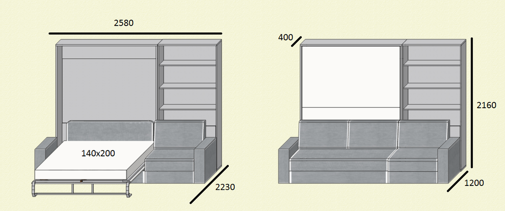 Оттоманка и стеллаж могут располагаться как справа так и слева