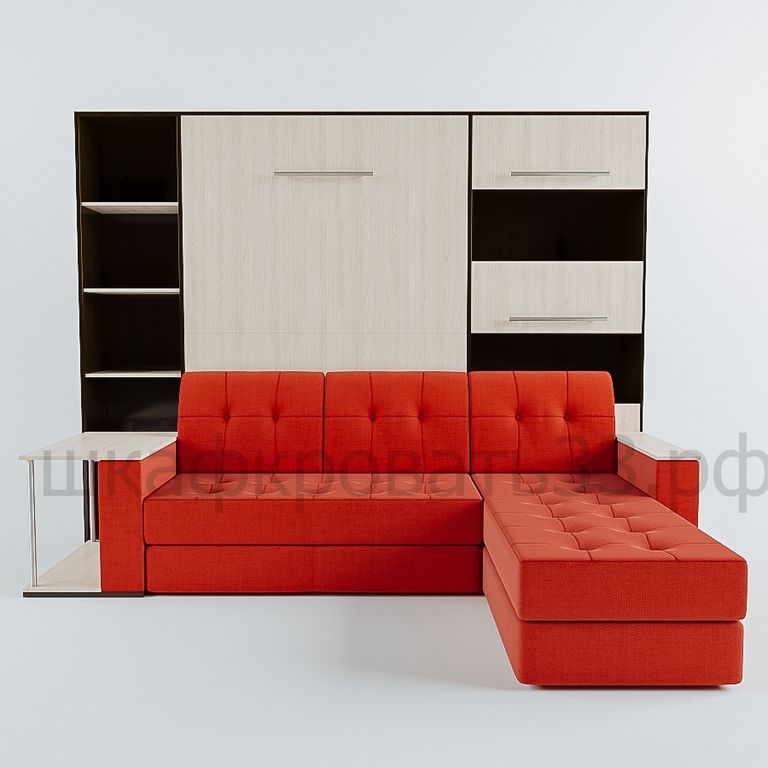 Наша фирма производит готовые решения для расширения пространства в вашем доме. Так откидная вертикальная кровать волшебным образом сделает вашу комнату больше на целых четыре квадратных метра и при этом даст возможность пользоваться в дневное время удобным угловым диваном с мягкими подлокотниками. Эта элитная модель так же оснащена двумя изящными стеллажами, на которых можно разместить книги или личные вещи.
