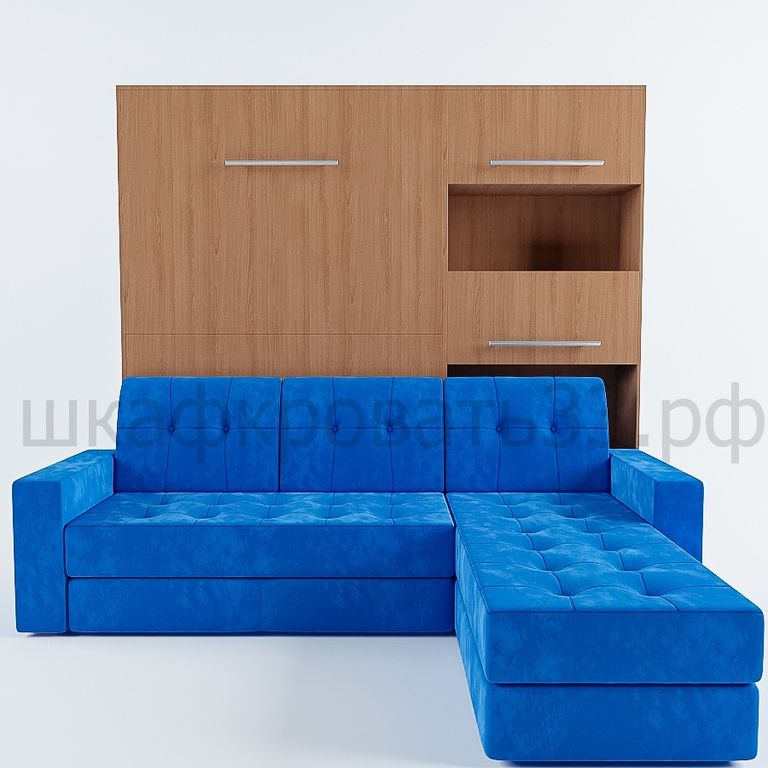 Откидная кровать с угловым диваном сделает ваше пространство гораздо комфортнее и функциональнее. В дневное время, в вашей комнате будет стоять изящный и удобный угловой диван с мдф подлокотниками, а ночью он с легкостью преобразуется в большую полноценную кровать. Постельные принадлежности можно убрать во внутренний ящик для хранения. Кроме того, у данной модели есть весомое достоинство – наличие вместительных стеллажей, которые помогут еще эффективнее сэкономить место в вашем доме.